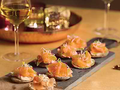 Een verantwoord borrelhapje: boekweitblini's met hummus en gerookte zalm. Een recept van EkoPlaza.