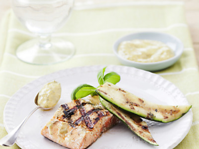 Bestrijk de zalm met de mosterd-dillesaus en druppel de olijfolie erover.