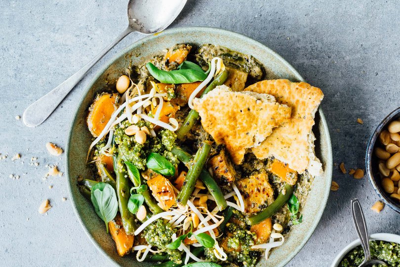 Maak een gevulde omelet. Klop eieren los en breng op smaak met zout en peper. Voeg eventueel fijngehakte kruiden toe. Kook de haricot verts gaar. Snijd de tempeh in blokjes en bak goudbruin, voeg spinazie en taugé toe. Roerbak tot de spinazie geslonken is. Bak de omelet in een koekenpan en vul deze met haricot verts, tempeh, spinazie en taugé. Garneer met pinda’s en basilicum of gebruik de Aziatische pesto.