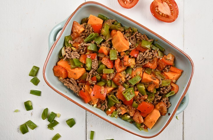 Verhit bakolie in een koekenpan en bak het gehakt rul. Bak de ui, tomaat en paprika mee zodra het gehakt gaar is. Doe de voorgekookte snijbonen en zoete aardappels bij het gehakt en verwarm nog 2 minuten. Proef en breng op smaak met harissa kruiden, zout en (chili)peper.