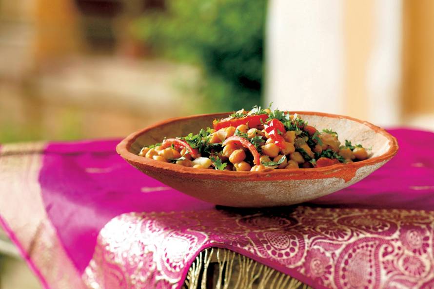 Vlak voor serveren kikkererwten bestrooien met komijn en koriander.
