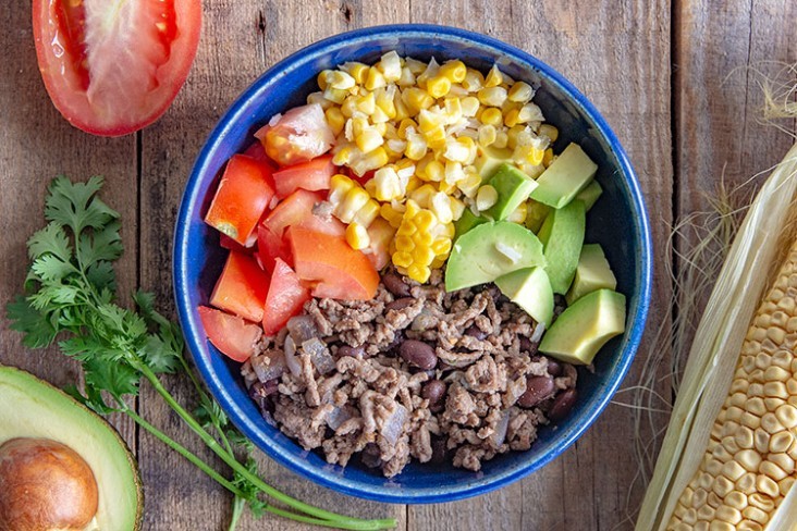 Een heerlijk zomers gerecht van Ekomenu: een Mexicaanse bowl. Dit gerecht kun je prachtig opmaken, wanneer je daar zin in hebt. Houd alle ingrediënten van elkaar gescheiden en leg in groepjes neer in je kom. Zo wordt het een kleurrijk geheel! Heb je daar geen zin in? Hussel dan alles door elkaar, even lekker!