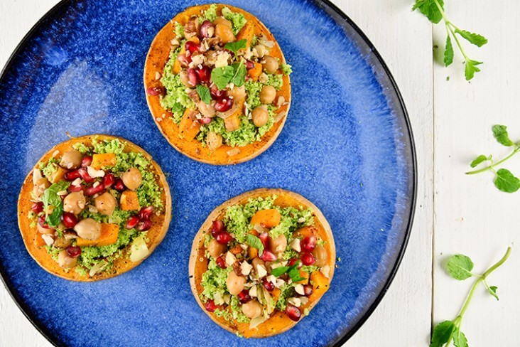 Schep het broccoli mengsel in de pompoen ringen. Garneer met de verse munt en hazelnoten.