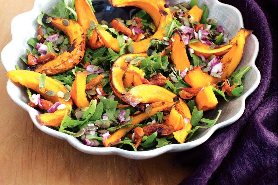 Je kunt de pompoen 4 uur van tevoren roosteren. Leg de afgekoelde parten op de salade.