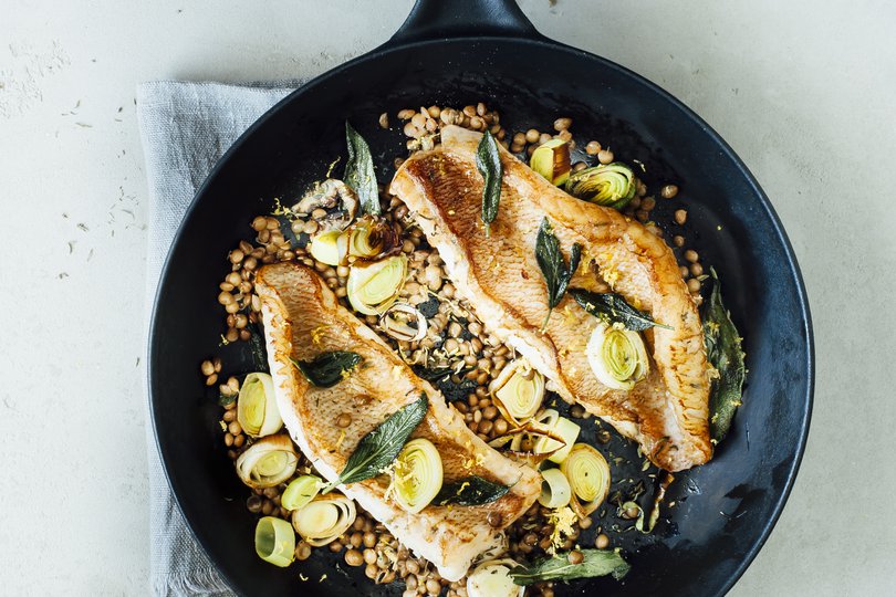 Schep de preiringen en linzen op de borden en leg de roodbaarsfilets er bovenop. Besprenkel met nog wat extra citroensap of geraspte citroenschil.
