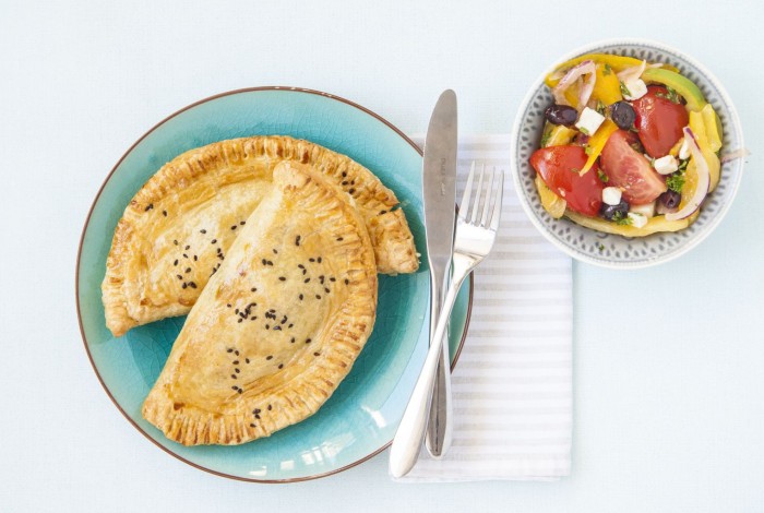 Leg op 1 helft van het rondje bladerdeeg 90-100 g vulling, bestrijk de rand met wat eigeel zodat deze makkelijk dicht blijft plakken, vouw goed dicht en druk aan met je vingers of een vork.